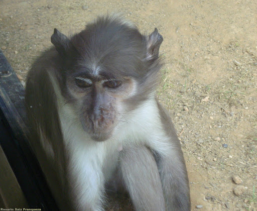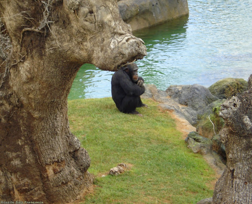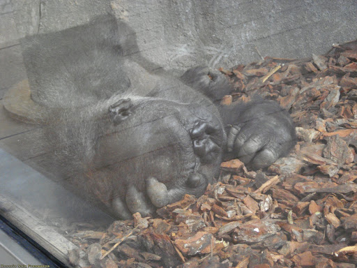 Este gorila provenía del antiguo zoo de Valencia, como ya es mayor, no se consigue aclimatar del todo a su nuevo habitat y esta separado , parece una persona durmiendo.