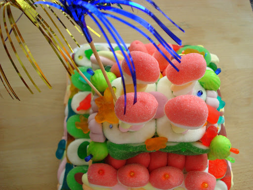 - Chuches variadas, yo he comprado unas bolsas en LIDL, y otras en Mercadona pues lo mío fué pensado y hecho y solo tuve un par de días para prepararlo todo, si hay mas tiempo y radio de movimiento, puedes desplazarte a sitios de gominolas especializados y aumentar el caché de tu tarta.